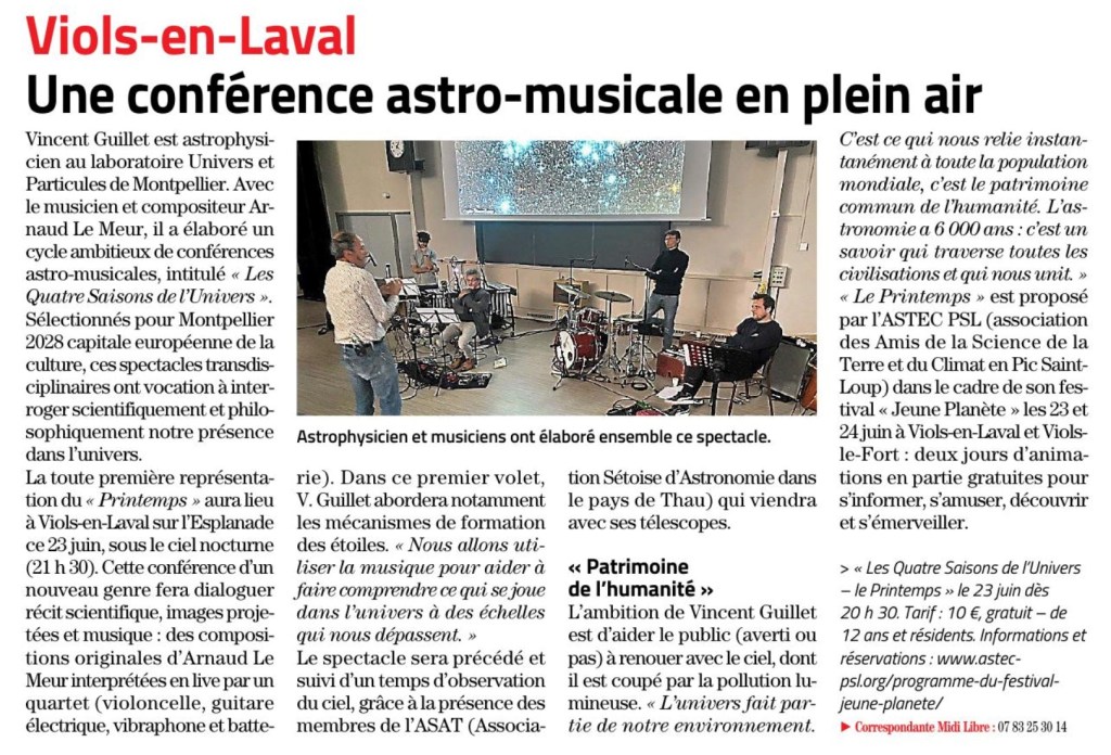 Un article du Midi Libre à propos de la conférence astro-musicale du 23 juin à Viols-en-Laval Publié parfestivalpv19 juin 2023Publié dansNon classé Ne tardez plus : réservez vos places ici … ou là —-> Partager : Cliquez pour partager sur Facebook(ouvre dans une nouvelle fenêtre) Facebook J’aime chargement… Similaire