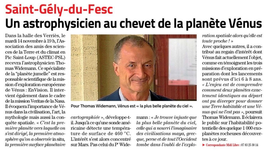 La conférence, gratuite et ouverte à toutes et à tous, aura lieu ce mardi 14 novembre à 19h, salle des Verriès à Saint-Gély-du-Fesc. Elle sera suivie d’une séance de questions/réponses et d’un pot amical.