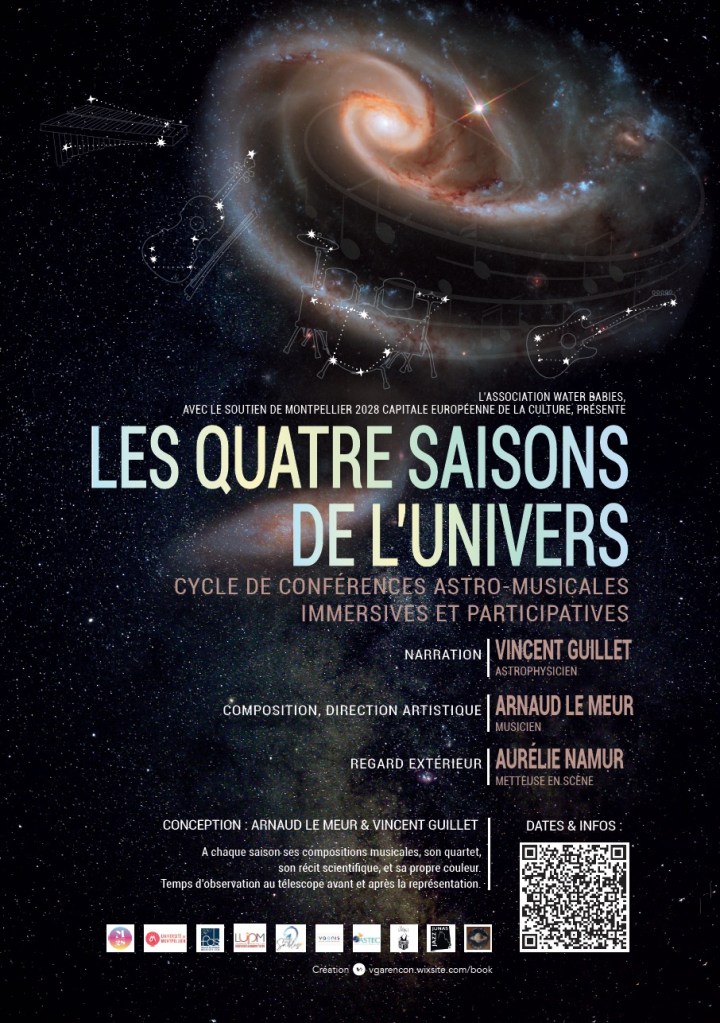 Ce projet est issu de la rencontre de l’astrophysicien Vincent Guillet, maître de conférence à l’Université de Montpellier et du musicien-compositeur Arnaud Le Meur, directeur artistique de l’association « Water babies ». Tous deux familiers de projets en interaction avec le public, qui croisent art et savoir, c’est à l’occasion d’une conférence étoilée au sein des « Palabrasives » — Villeneuve-lès-Maguelone — qu’est né le désir de poursuivre ce projet sous une forme plus ambitieuse, musicale et mise en scène. Ils ont ainsi confié la dramaturgie générale et le regard extérieur à Aurélie Namur (Compagnie conventionnée Les Nuits Claires – Occitanie). Les 4 saisons de l’Univers sont en partenariat avec l’association Ateliers Des Sables.