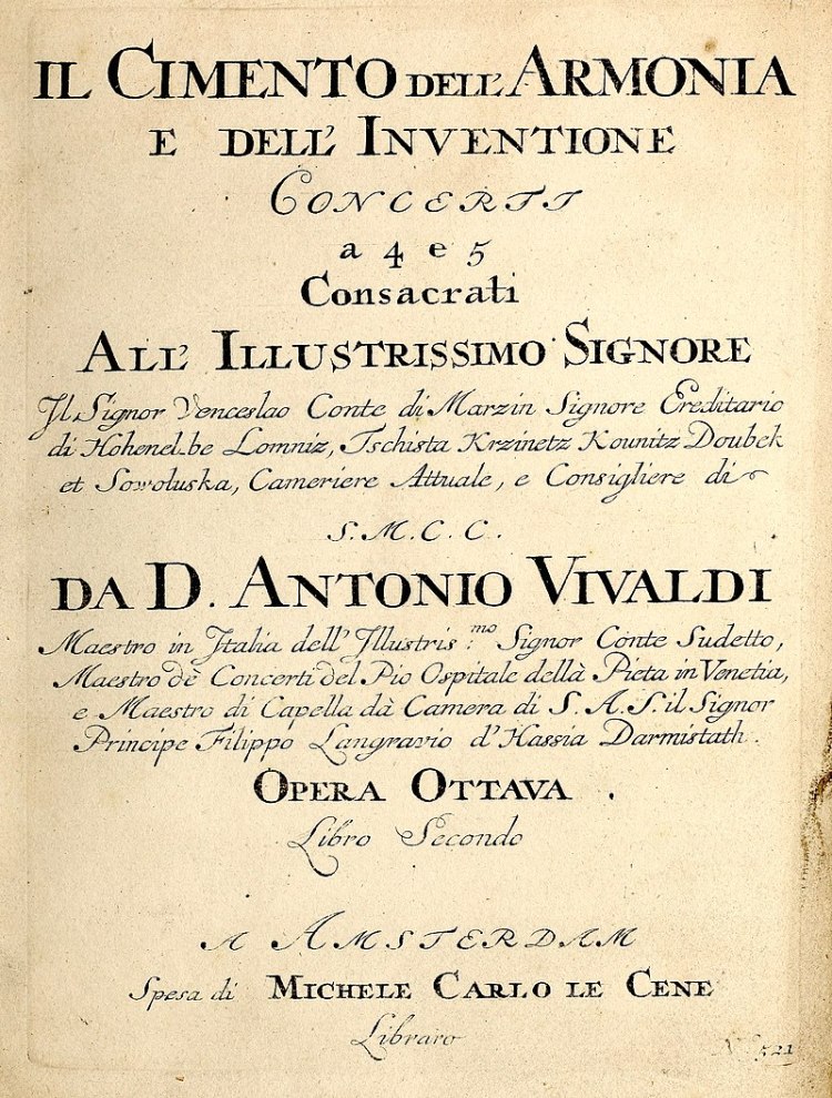 « La confrontation entre l’harmonie et l’invention, couverture du recueil de 12 concertos, dont les quatre premiers sont les Quatre Saisons, conservé au .musée international et bibliothèque de la Musique de Bologne.