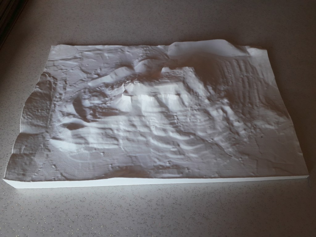 Cette maquette, imprimée à l’Atelier de Claret par une imprimante 3D en fil fondu peut être reproduite à différentes tailles. Elle représente le modèle numérique de terrain (MNT), altitude avec 1m de résolution par pixel. Les données ont été fournies par l’IGN.